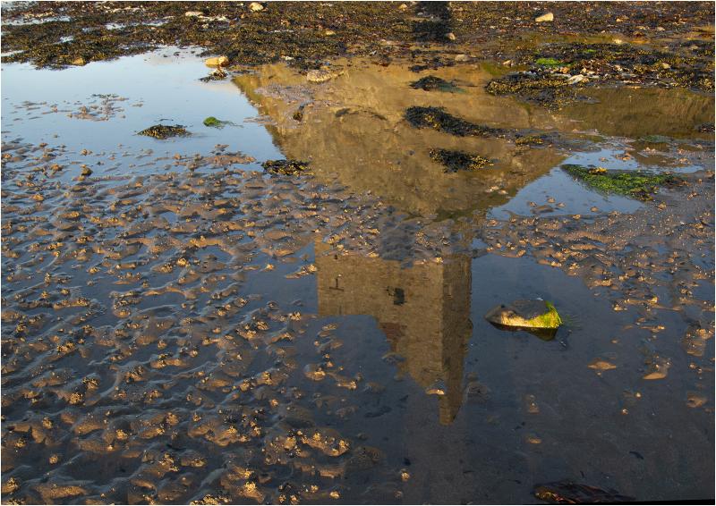 I like that the castle is almost, but not quite, completely abstracted by the reflection, seaweed and ripples in the sand.  Very well thought out and an interesting and different perspective.