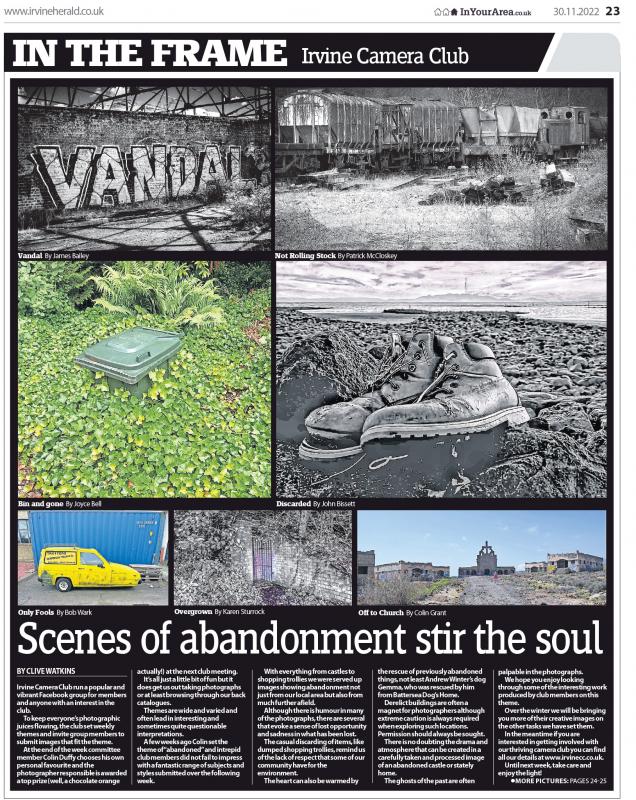 Themes are wide and varied and often lead in interesting and sometimes quite questionable interpretations. A few weeks ago Colin set the theme of “abandoned” and our intrepid members did not fail to impress with a fantastic range of subjects and styles submitted to the group over the following week. With everything from castles to shopping trollies we were served up images showing abandonment not just from our local area but also from much further afield.