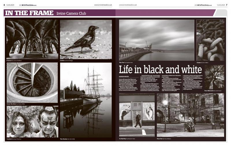 At Irvine Camera Club we run a weekly challenge competition throughout the year on Facebook for members to encourage them to continue shooting all year round, stretch their creativity and to have somewhere a little more relaxed to post images. Every week at our meeting a winning image is announced, and a top prize is given out. This week the theme is ‘Black and White’ and the images being presented are a selection of those up for a prize this week.
