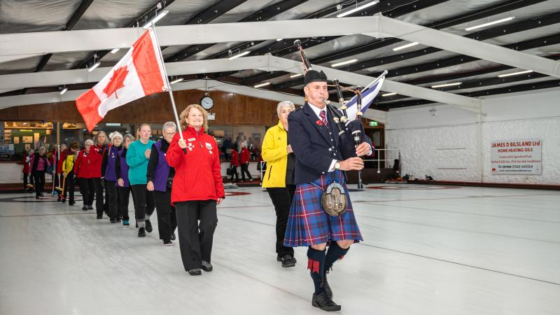 After a morning social tour of Paisley Abbey, the players were piped into the Greenacres rink. The teams were then formally pip[ed onto to the ice with Provost Lorraine Cameron and Scottish curling legend Rhona Martin looking on. The first stone was thrown by 2024 Scottish Senior Women’s Champion, Karen Kennedy of Ayr.