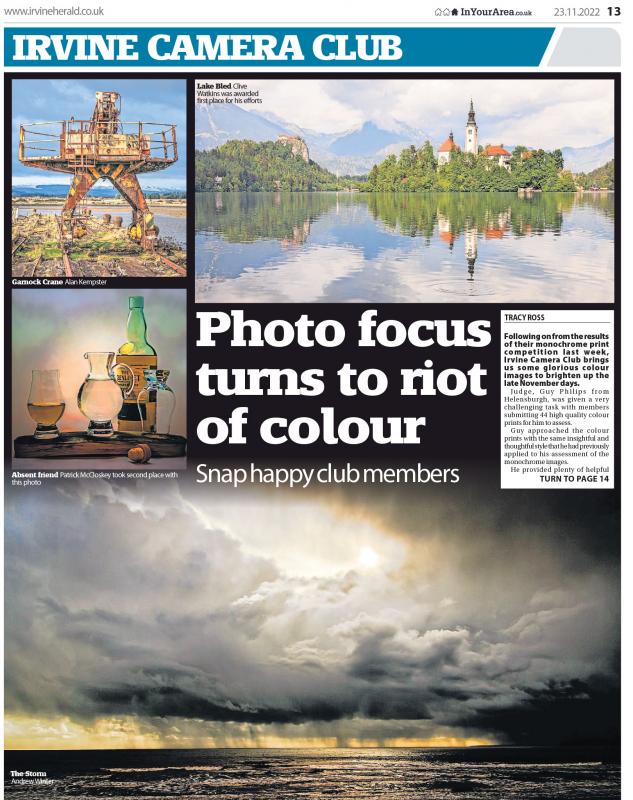 Following on from the results of our monochrome print competition last week, Irvine Camera Club brings you some glorious technicolour images to brighten up your late November days. Our judge, Guy Philips from Helensburgh, was given a very challenging task with our members submitting 44 high quality colour prints for him to assess.
