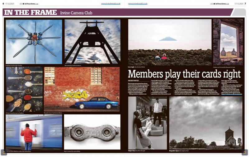 The images presented here from Irvine Camera Club were entered as a part of our annual friendly ‘Play Your Cards Right’ competition in which members picked cards at random that were all linked to subjects and techniques. Being random, members are faced with having to come up with new images, often of subjects unfamiliar to them using a variety of techniques that again are designed to push them into new areas of photography to see what they can come up with.
